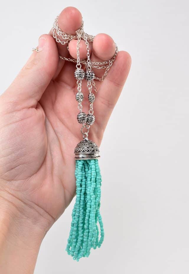 And there she is. At just over 1% of the purchase price of what I had found and drooled over online this accessory was a total steal. PLUS I was able to make the design more “me” has a silver chain with a few decorative beads near the tassel rather than a solid bead necklace the whole way around. Yes, I saved a ton of money, but let’s face it I’m never going to spend that kind of money on a necklace, anyway. For me, handmade jewelry means I can have things similar to what is popular and often expensive on my itty bitty fashion budget!