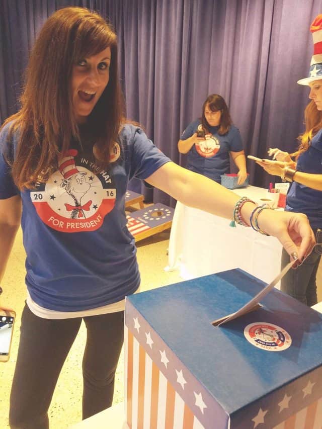 “Part of Carnival Cruise Line’s “Head of State Play Date” at the hospital, the #CatinHat4Prez-themed event coincides with the release of the new Dr. Seuss book, “One Vote, Two Votes, I Vote, You Vote,” that teaches kids about the election process and the importance of voting.”