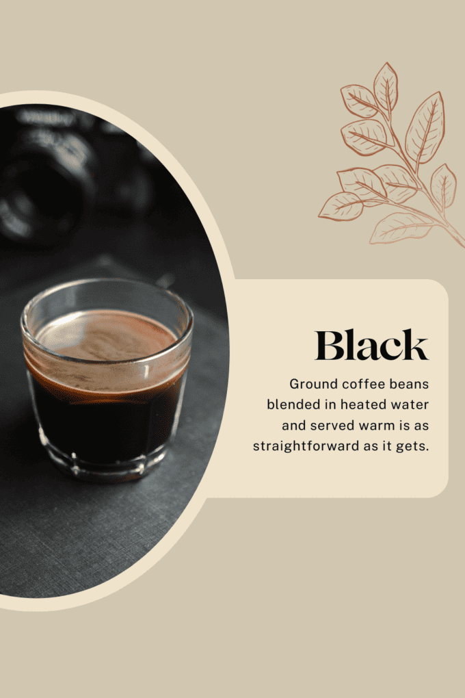 The simplest and timeless classic, black coffee is the essence of coffee purity. Brewed by infusing ground coffee beans with hot water, it delivers a bold and unadorned coffee flavor, perfect for purists.