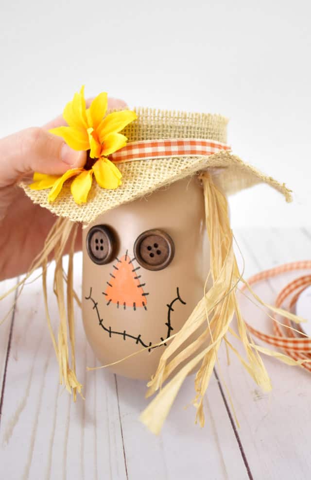 And here’s our adorable gentleman scarecrow mason jar. Don’t you just love him? Let’s finish up his lady friend…