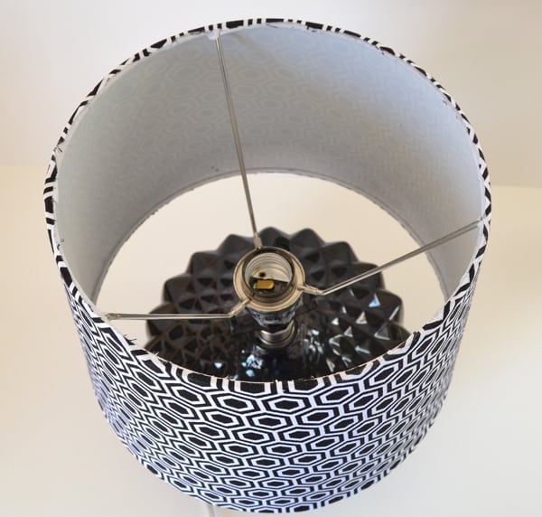 Once the lamp is wrapped all of the ways around and the fabric is holding firmly, glue the fabric just to the very edge of both the top and bottom of the shade. It’s okay to go a bit wild with the adhesive because the firmer the fabric is the better your cuts will be in the next step. Be sure that the shade is completely dry before continuing.