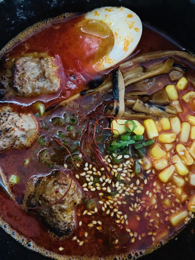 Spicy Miso (my personal fav): rich chicken broth, roasted garlic miso, pork meatballs, corn, menma, ajitama, goma, negi.